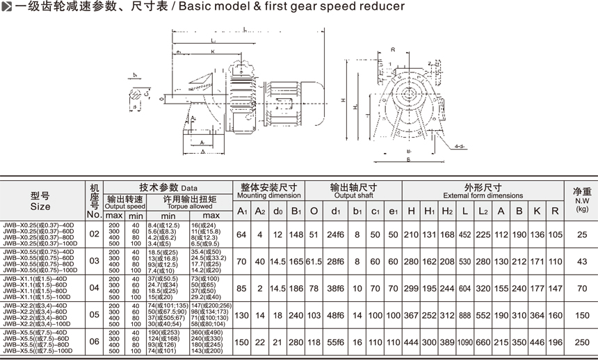 JWB-X系列無級變速機一級二級參數(shù)與尺寸表