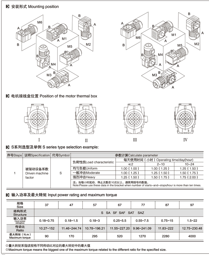 2、安裝方式:底腳安裝、空心軸安裝、法蘭安裝、扭力臂安裝、小法蘭安裝。