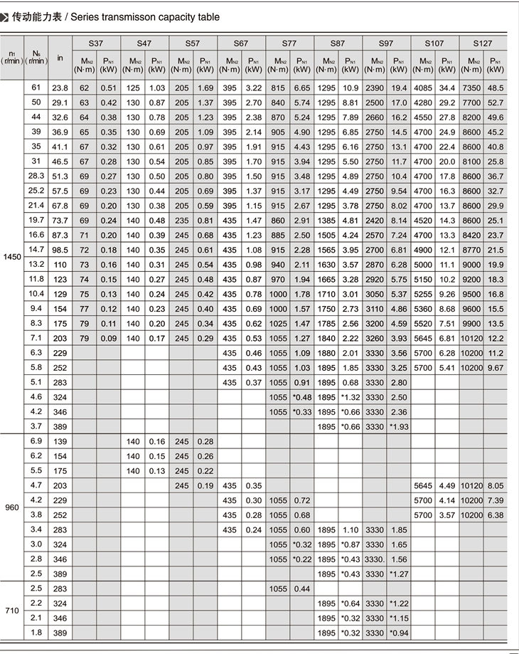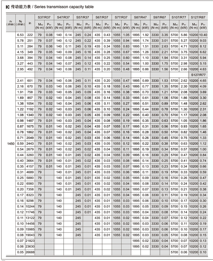 4、平均效率:減速比7.5-69.39是77% ;70.43-288是62% ;S/R組合式是57%。